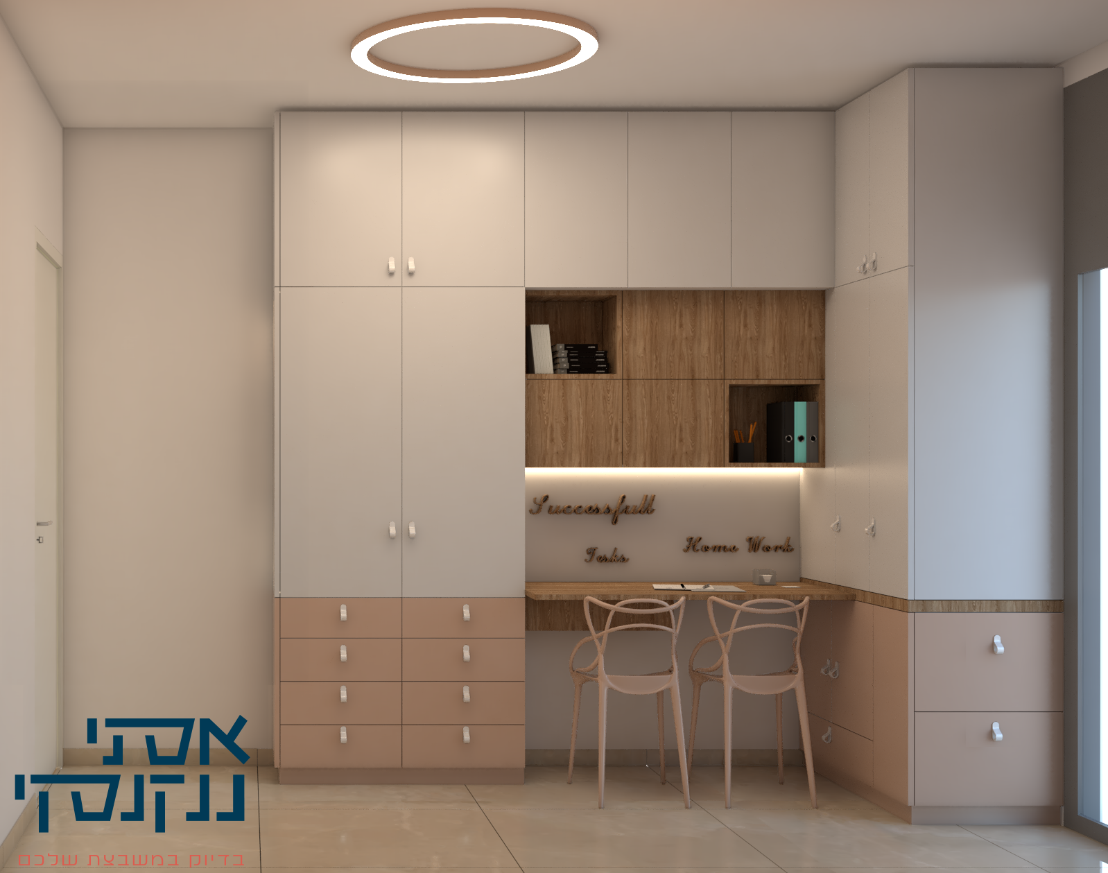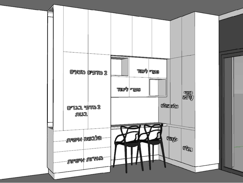 כנראה היא ראתה שבאמת באמת החדר החדש יעשה לה הרבה סדר בבית, כי לכל דבר יש מקום בחדר החדש- לילקוטים, למעילים, לנעליים, למחברות, ביגוד ל-4 בנות...תליה ארוכה, תליה קצרה, מדף בגדים, מגירת בגדים, מצעים, חילופי עונות ואפילו שולחן כתיבה ל-2.